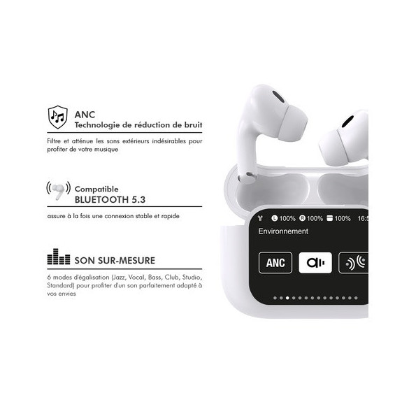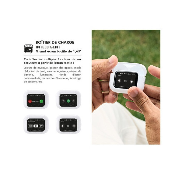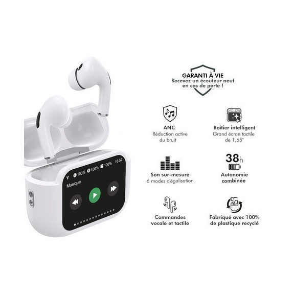 Garantie à vie ! Profitez d’une expérience audio haut de gamme avec ces écouteurs sans fil nouvelle génération offrant jusqu’à 38 heures d’autonomie. Parfaits pour vos journées bien remplies, vos trajets ou vos séances de sport, ils assurent une connexion Bluetooth 5.3 ultra-stable et instantanée dès leur sortie du boîtier. Leur boîtier intelligent avec écran tactile 1,65" vous permet de contrôler la musique, les appels, le volume, l’égaliseur et même le mode anti-bruit d’un simple geste. Grâce à la technologie ANC, profitez d’une immersion sonore totale en éliminant les bruits extérieurs.