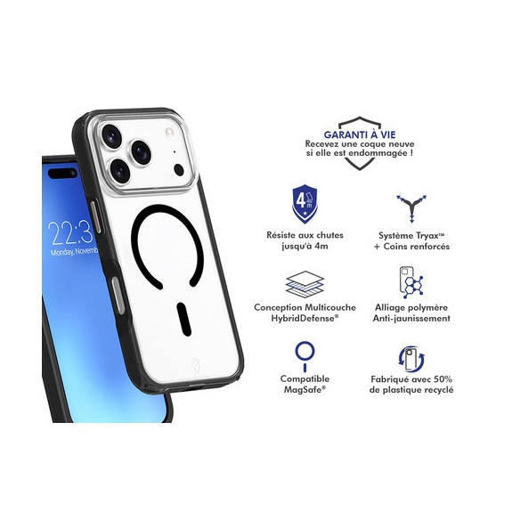 Les bords surélevés protègent efficacement l’écran et la caméra, tandis que son système aimanté renforcé est 100% compatible Magnet & MagSafe pour une charge rapide et stable. Son revêtement mat anti-traces, ses boutons métalliques interchangeables et son traitement anti-jaunissement garantissent élégance et durabilité. Éco-conçue avec 50% de plastique recyclé et couverte par une garantie à vie, cette coque allie protection, design et responsabilité.