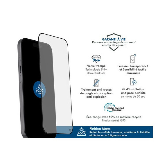 Sa finition mate anti-reflets assure un confort visuel optimal même en pleine lumière, tout en réduisant la fatigue oculaire lors d’un usage prolongé. Le toucher doux facilite la navigation, tandis que son traitement oléophobique limite les traces de doigts. Grâce à son kit de pose exclusif, l’installation est rapide et sans défaut en moins de 30 secondes. Éco-conçu avec 60% de verre recyclé et certifié GRS, il allie performance, confort et responsabilité environnementale.