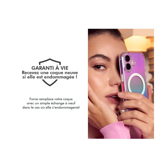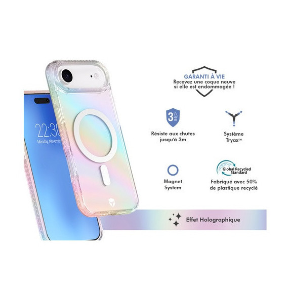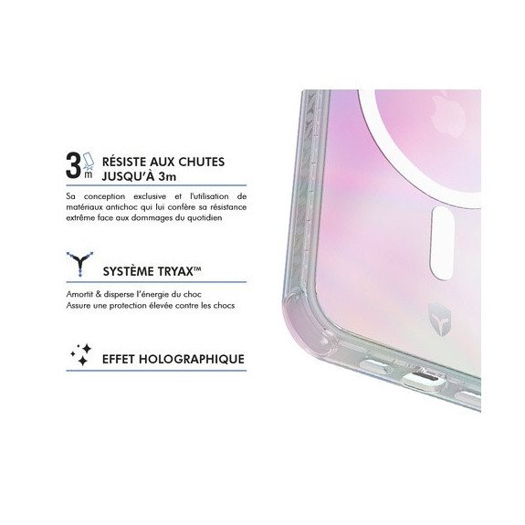 Garantie à vie ! Résistante aux chutes de 3m, la coque Renforcée Air MagSafe Holo de Force Case combine finesse et robustesse grâce à ses technologies exclusives Air Cushion et Tryax. Ses aimants renforcés assurent une fixation optimale sur les accessoires MagSafe.